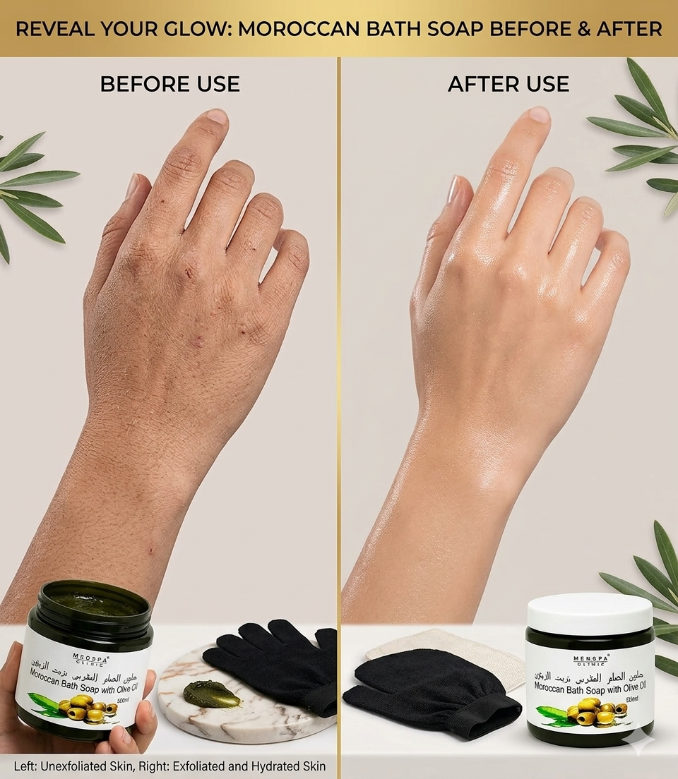 Olive oil Moroccan soap, also known as “sabon beldi” or black soap, is a time-honored skincare product that has been used for centuries in traditional Moroccan hammams, or steam baths. It is made from a rich blend of natural ingredients, with olive oil being a key component. This luxurious soap is handcrafted using traditional methods that involve hand-pressing olives to create a rich, smooth paste that is then infused with other natural ingredients such as argan oil, eucalyptus oil, and various botanical extracts. Olive oil is known for its moisturizing and nourishing properties, making it an excellent ingredient for skincare products. The soap has a dark, velvety texture and is often used as part of a purifying and exfoliating ritual. When applied to damp skin and gently massaged in circular motions, it helps to remove dead skin cells, unclog pores, and improve overall skin texture. Olive oil Moroccan soap is suitable for all skin types and can be used on the face and body. It is known for its gentle cleansing properties, leaving the skin feeling refreshed, revitalized, and deeply cleansed. The rich blend of natural oils in the soap helps to moisturize and nourish the skin, leaving it feeling soft, supple, and rejuvenated. In addition to its skincare benefits, olive oil Moroccan soap is also prized for its soothing and calming properties. It is often used in aromatherapy due to its natural, earthy scent that promotes relaxation and well-being.